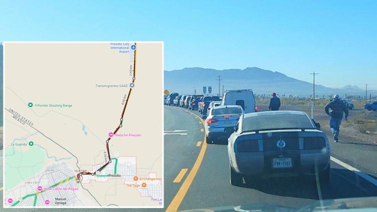 La fila es tan larga que incluso hay unos 10 kilómetros de automóviles formados, esperando incluso para entrar a Presidio, más toda la distancia que deben recorrer en la localidad y luego para el cruce internacional a México por Ojinaga.