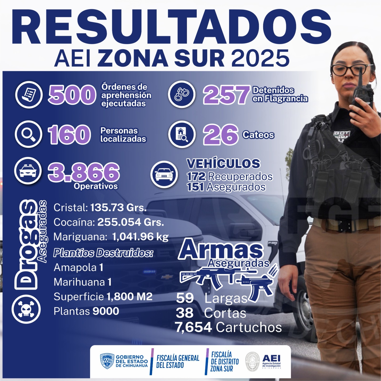 Derivado del trabajo permanente de inteligencia, investigación y operatividad, la Agencia Estatal de Investigación (AEI), adscrita a la Fiscalía de Distrito Zona Sur, obtuvo resultados relevantes en el combate a los delitos y en el fortalecimiento de la seguridad durante el año 2025.