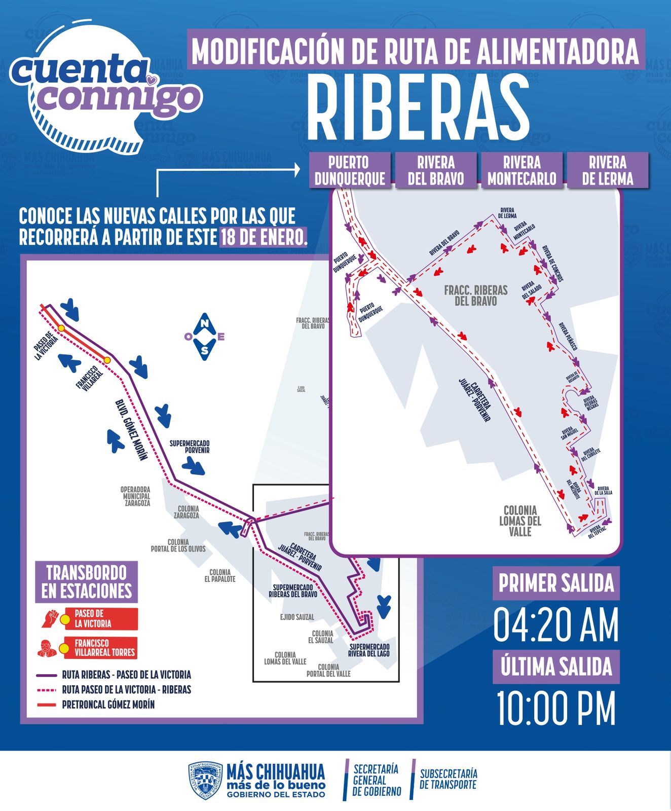 La Secretaría General de Gobierno, a través de la Subsecretaría de Transporte, informó que a partir de este domingo 18 de enero se modificará el recorrido de la ruta Riberas del Bravo del sistema de transporte JuárezBus, con el fin de beneficiar a un mayor número de habitantes.