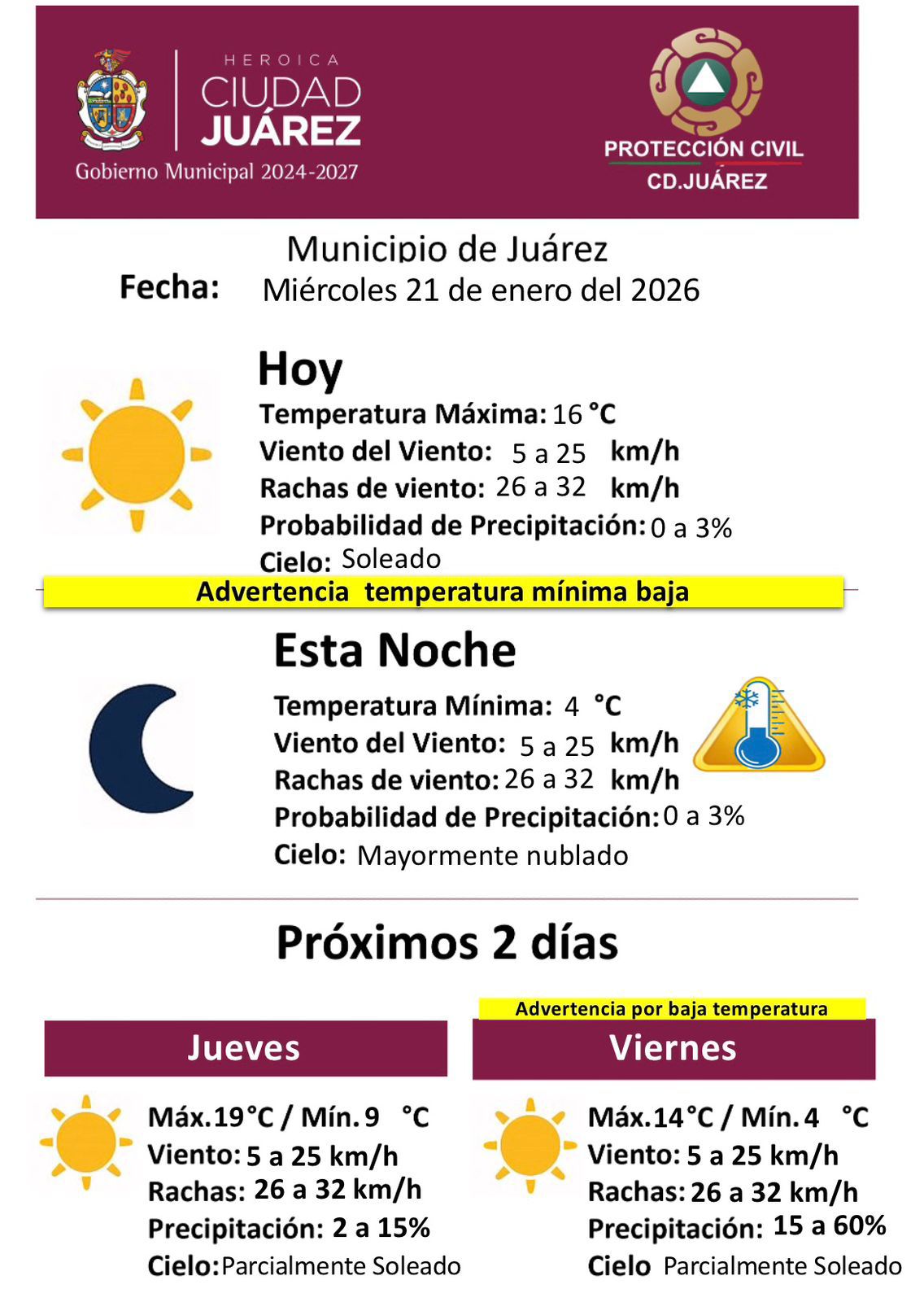 La Dirección General de Protección Civil del Municipio de Juárez informó el pronóstico meteorológico para este miércoles 21 de enero de 2026, en el que se prevé un día soleado con temperaturas frescas y una advertencia por descenso en la temperatura mínima durante la noche.