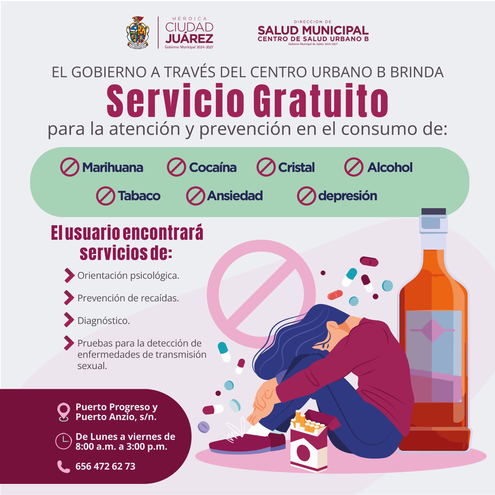Las personas interesadas pueden comunicarse al teléfono 656-472-6273, en un horario de 8:00 de la mañana a 3:00 de la tarde, de lunes a viernes, o acudir directamente a las instalaciones ubicadas en el cruce de las calles Puerto Progreso y Puerto Anzio, en la colonia Portal del Roble, donde recibirán atención profesional y confidencial.