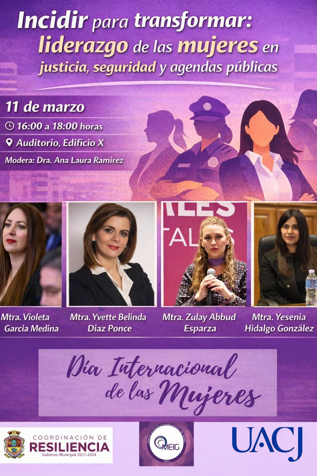 La Oficina de Resiliencia invita a la comunidad a participar en el diálogo sobre el liderazgo de las mujeres en los ámbitos de justicia, seguridad y agendas públicas, un espacio de reflexión que se realizará este 11 de marzo en el Auditorio del Edificio X de la Universidad Autónoma de Ciudad Juárez.