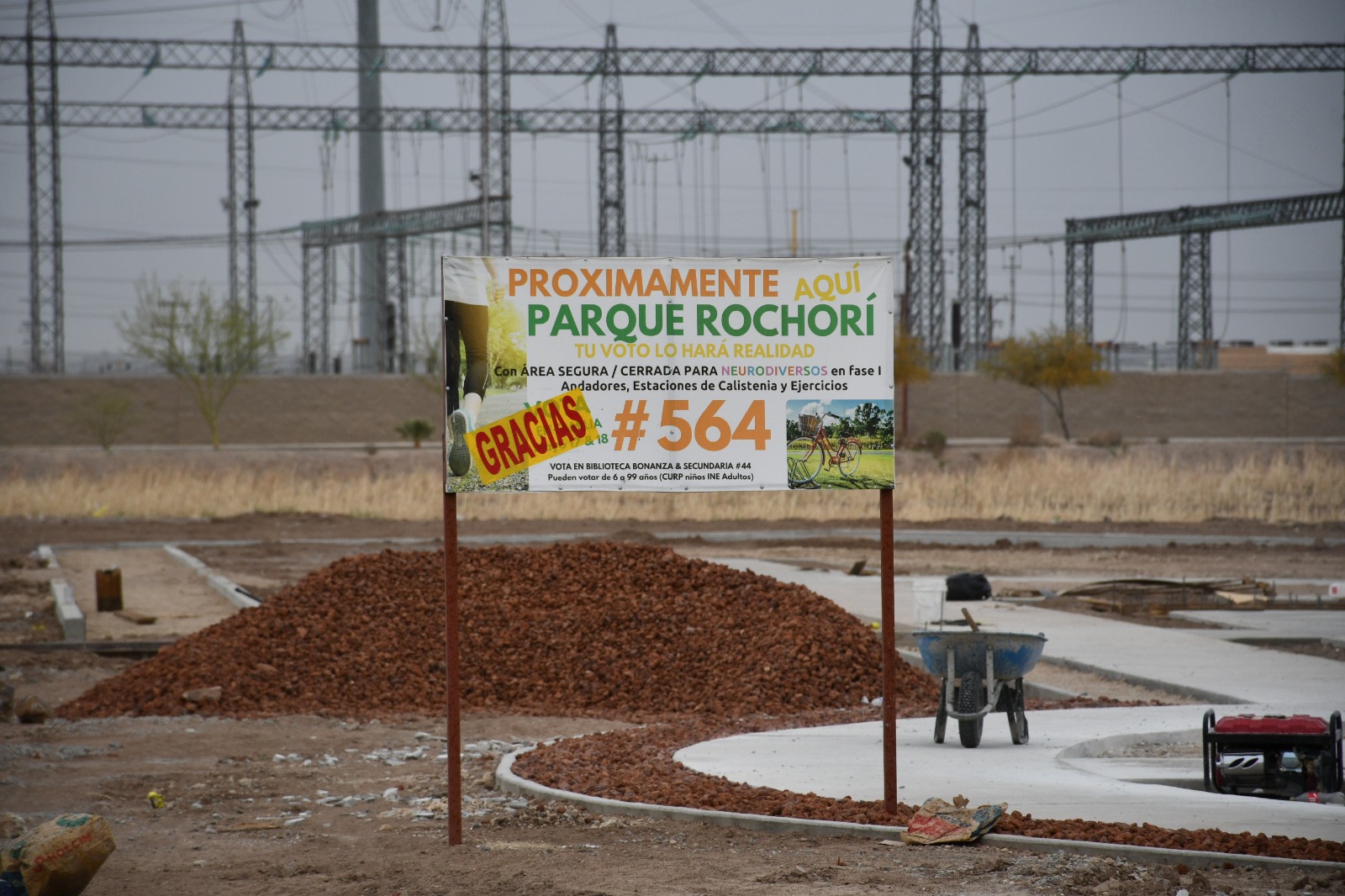 La Dirección General de Obras Públicas trabaja en la construcción del parque Rochori, proyecto que contempla un diseño sensorial e inclusivo, al ser propuesto por los vecinos del fraccionamiento La Sarzana a través del programa de Presupuesto Participativo.