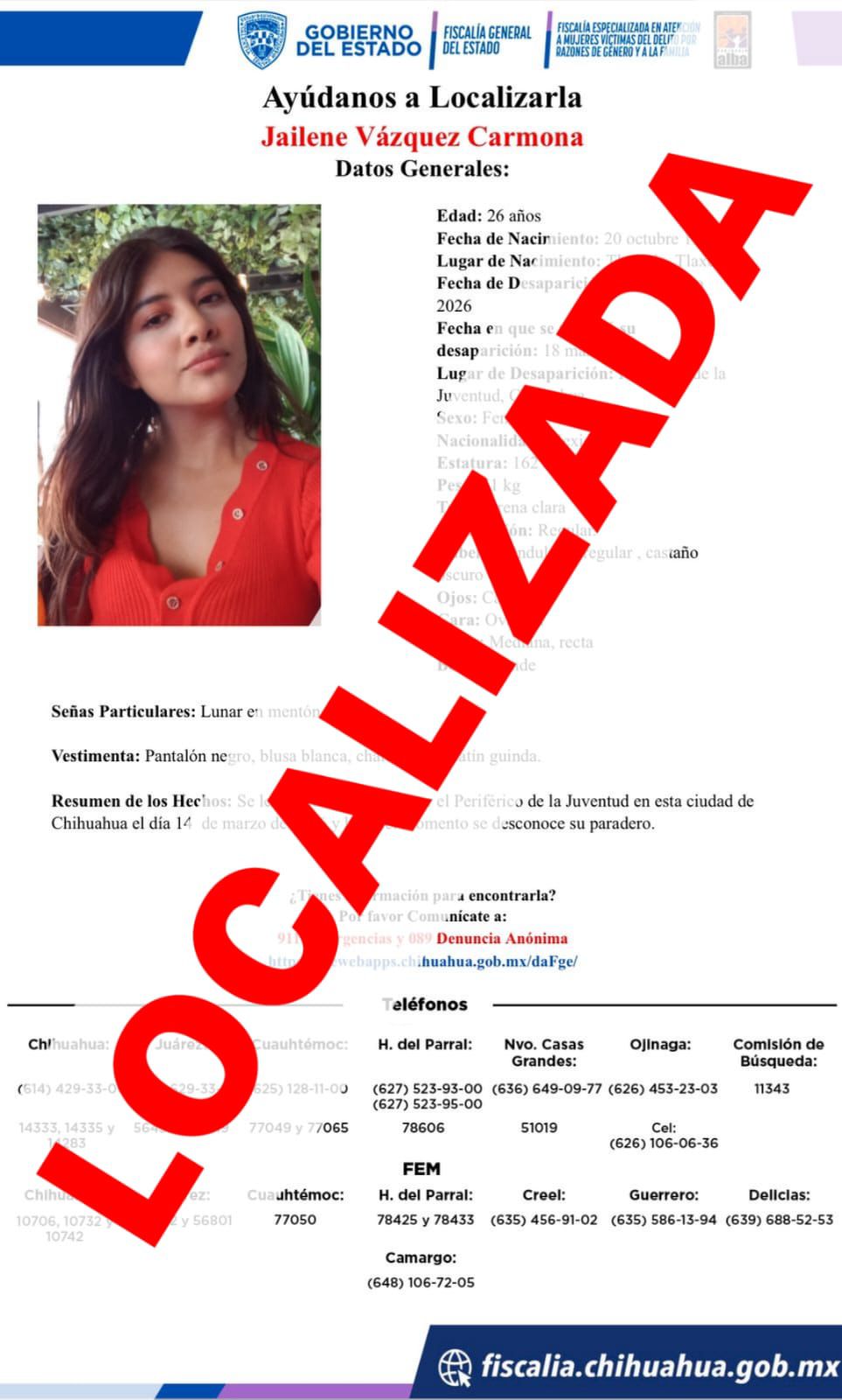 La mujer de 26 años fue reportada como ausente ante la Unidad de FEM el pasado 18 de marzo del 2026 por lo que se iniciaron de inmediato las acciones tendientes a su búsqueda así como la difusión masiva de la pesquisa.